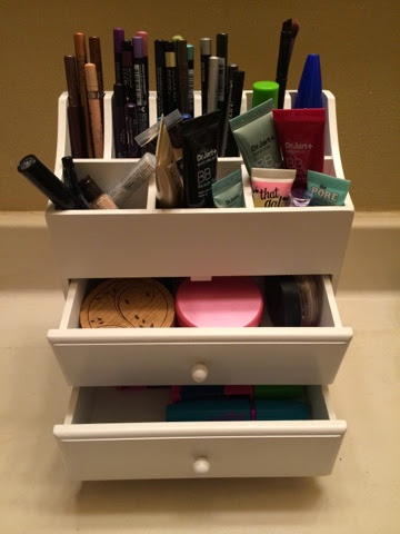 I've been trying to do a bit of organizing recently--some late spring cleaning, if you will. My bedroom is a bit overwhelming at the moment because it's brimming with craft supplies I refuse to purge (but I might need this some day), but my bathroom is slightly more manageable. I knew I wanted something to organize my makeup but have it still be easy to snatch at before my morning coffee. This makeup caddy helps my bathroom look a bit more minimalist without actually getting rid of anything. I picked mine up at TJ Maxx for about $16.